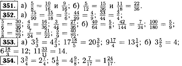 346. а) 96, 110, 10, 150, 6; б) 48, 4, 52, 90, 5; в) 0,5, 0,3, 6,3, 9, 5,6; г) 1,2, 6, 60, 40, 0,4; д) 6, 0,3, 3,6, 0,6, 0,3. 347. а) 3 : 2 = 1,5, 3:6 = 0,5, 3 • 0,1 = 0,3, 3 • 0,5 = 1,5, 3 : 10 = 0,3; б) 2 : 5 = 0,4, 0,4 : 0,1 = 4, 4 : 8 = 0,5, 0,5 : 0,2 = 2,5, 2 : 0,5 = 4, 2 : 0,8 = 2,5. 348. а) 0,72 - 0,62 = 0,7 • 0,7 - 0,6 • 0,6 = 0,49 - 0,36 = 0,13; б) 33 - 17,5 = 3 • 3 • 3 - 17,5 = 27 - 17,5 = 9,5; в) 0,52 • 8 = 0,5 • 0,5 • 8 = 2; г) 2,6 : 0,13 = 2,6 : 0,001 = 2600. 349. а) (2,9 - 0,82 : 0,4) • 0,2 = 0,17; б) 3,5 : (0,25 • 0,16 + 1,36) = 2,5. 350. Делители числа 220: 1, 2, 4, 5, 10, 11, 20, 22, 44, 55, 110. Сумма этих делителей равна 284. Делители числа 284: 1, 2, 4, 71, 142. Сумма этих делителей равна 220. Значит эти числа дружественные.