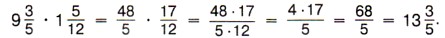 Обычно вначале обозначают произведение числителей и произведение знаменателей, затем производят сокращение и только потом выполняют умножение. В ответе, если это возможно, из дроби исключают целую часть. Например:
