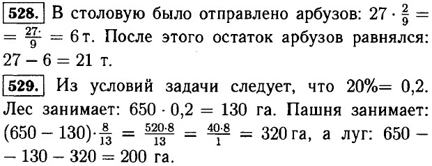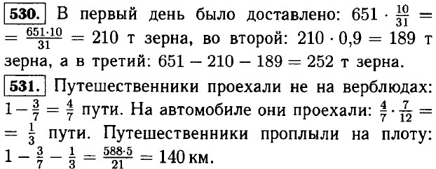 532. Из условий задачи следует, что 30%= 0,3 и 80% = 0,8. Вторая бригада прополола: 0,3 • 0,8 = 0,24 всей площади. Третья бригада прополола: 1 - 0,3 - 0,24 = 0,46 или 46% всей площади. 533. В первом ящике было х кг вишни. Во втором ящике было 2х кг вишни, а в третьем было х + 8 кг. В трёх ящиках было 76 кг вишни. Составим и решим уравнение: х + 2х + х + 8 = 76 ⇒ 4х = 68 ⇒ х = 17 кг вишни было в первом ящике. Во втором ящике: 2х = 2 • 17 = 34 кг. В третьем ящике: х + 8 = 17 + 8 = 25 кг. 534. а) 27,36 • 0,1 - 0,09 = 2,736 - 0,09 = 2,646; б) (54,23 • 3,2 - 54,13 • 3,2 + 0,68) : 0,2 = ((54,23 - 54,13) • 3,2 + 0,68) : 0,2 = (0,1 • 3,2 + 0,68) : 0,2 = (0,32 + 0,68) : 0,2 = 1,0 : 0,2 = 5; в) (23,82 + 54,58) • (1,202 + 0,698) - 2,1 • (3,53 - 1,89) = 78,4 • 1,9 - 2,1 • 1,64 = 148,96 - 3,444 = 145,516; г) 316219 - (27090 : 43 + 16 422 : 119) = 316 219 - (630 + 138) = 316 219 - 768 = 315 451.