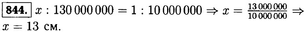 840. Пусть масштаб карты равен 1 : 22500000. Результат измерения расстояния на карте между Москвой и Киевом равен приблизительно 3,3 см. Расстояние между городами на местности будет равно: 3,3 • 22 500 000 = 74 250000 см = 742 500 м = 742,5 км. 841. Выполните задание самостоятельно. 842. Масштаб плана равен: 1 см : 20 м= 1 : 2000. 843. 25 : х = 1 : 300 ⇒ х = 25 • 300 ⇒ х = 7500 см= 75 м. — длина дома на местности.