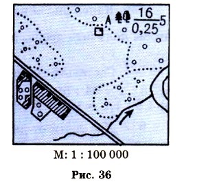 820. Определите по карте (рис. 36) расстояние от опушки леса (точка А) до точки пересечения дороги с рекой. Масштаб карты 1 : 100 000.