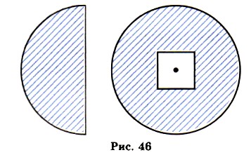 867. С помощью тонкой нити измерьте длину какой-нибудь окружности (на стакане, ведре, тарелке), измерьте длину диаметра. Найдите отношение длины окружности к длине диаметра и сравните полученный результат с числом 868. Найдите длину окружности, если её радиус равен 36 см; 0,44 см; 125 км. (Число 869. Диаметр колеса тепловоза равен 180 см. За 2,5 мин колесо сделало 500 оборотов. С какой скоростью идёт тепловоз? 870. Выполните измерения и вычислите площадь каждой заштрихованной фигуры (рис. 46).