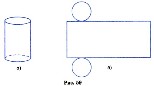 915. Из цифр 7, 8, 3 и 5 составьте четыре различных числа, оканчивающиеся цифрой 7 и кратные 3. 916. На рисунке 59, а изображён цилиндр. Сверху и снизу цилиндр ограничен кругами, которые называются основаниями цилиндра. Развёртка боковой поверхности цилиндра — прямоугольник. На рисунке 59,6 изображена развёртка поверхности цилиндра. Попробуйте вычислить площадь поверхности цилиндра, если его высота 5 см, а радиус оснований 2 см.