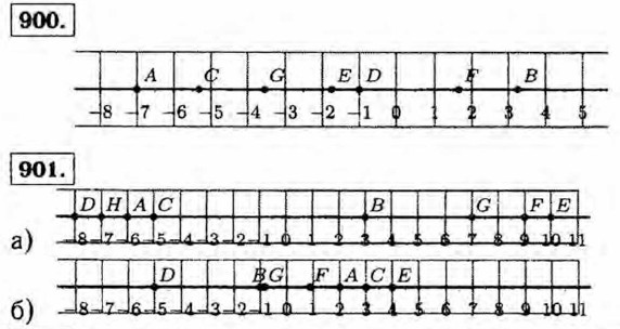 902. Приблизительная высота гор: Эльбрус — 5600 м, Казбек — 5100 м, пик Победы — 7500 м, Эверест — 8800 м, Этна — 3300 м, вулкан Везувий — 1300 м. Приблизительная глубина морей и океанов: Каспийское море — 1000 м, Чёрное море — 2300 м, Средиземное море — 5500 м, Марианский жёлоб — 11000 м. 903. Расстояние АВ равно: 2 + 7 = 9 единичных отрезков. 904. а) 11,5; 15; 1000; б) -10; -15; -30; в) -820,5; 900; -1000; г) -75; 0; 100. 905. Выполните упражнение самостоятельно. 906. Этот термометр показывает температуру: +10°.