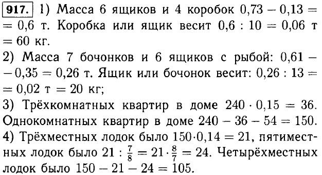 923. Пусть х — длина маленьких пролётов моста, тогда х + 14 м — длина большого пролёта моста. Длина моста, то есть сумма длин всех пролётов, равна 234 м. Составим и решим уравнение: 4х + х + 14 = 234 ⇒ 5х = 220 ⇒ х = 44 м — длина маленьких пролётов. Длина большого пролёта: х + 14 = 58 м. 924. Число экскурсантов делится на 4 и 6, значит, оно делится и на 24. Среди чисел, больших 40 и меньших 50, такое число одно: 48. Экскурсантов было 48 человек.