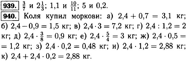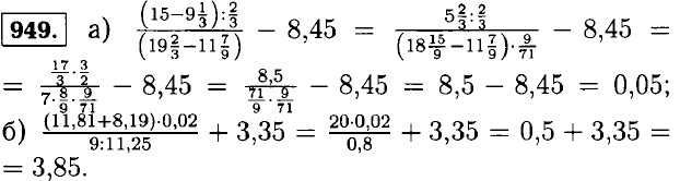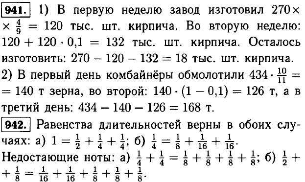 946. Пусть в первый день было выдано х кг проволоки, тогда во второй день было выдано 2 • х кг, в третий 3 • х кг. В первый день было выдано проволоки на 30 кг меньше, чем в третий день. Составим и решим уравнение: 3х - х = 30; 2х = 30; х = 15; 2х = 30; 3x = 45. За три дня было выдано: 15 + 30 + 45 = 90 кг проволоки. 947. Пшеница нового сорта даёт с одного гектара: 60,8 + 60,8 • 0,25 = 76 ц. С 23 га поливного поля колхоз теперь собирает: 76 • 23 = 1748 ц пшеницы. 948. а) 7,3x - 4,3 - 2,8x = 9,2 ⇒ 4,5x - 4,3 = 9,2 ⇒ 4,5x = 13,5 ⇒ х = 3; б) 6,2у + 2,9 - 3,4у = 8,5 ⇒ 2,8у + 2,9 = 8,5 ⇒ 2,8 у = 5,6 ⇒ у = 2.