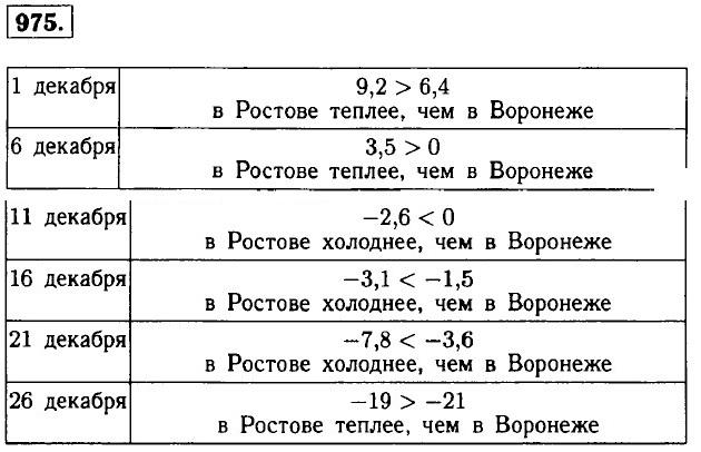976. а) 8,9 < 9,2; б) -240 < 3,2; в) 4,5 > -800; г) -5,5 > -7,2; д) -96,9 < -90,3; е) -1000 < 0; ж) -53 < 71; з) -253 > -412. 977. Города в порядке возрастания их высоты над уровнем Мирового океана: Астрахань, Санкт- Петербург, Париж, Москва, Ереван, Мехико. В порядке убывания: Мехико, Ереван, Москва, Париж, Санкт-Петербург, Астрахань.