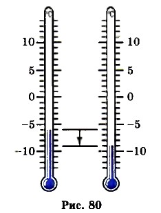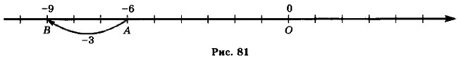 § 6. Сложение и вычитание положительных и отрицательных чисел 32. Сложение отрицательных чиселПусть температура воздуха была равна -6°С, а потом она изменилась на -3°С (т. е. понизилась на 3°С). Тогда она станет равной -6 + (-3) градусам (рис. 80). Чтобы сложить числа -6 и -3 с помощью координатной прямой, надо точку А (-6) переместить влево на 3 единичных отрезка (рис. 81). Получим точку В(-9).