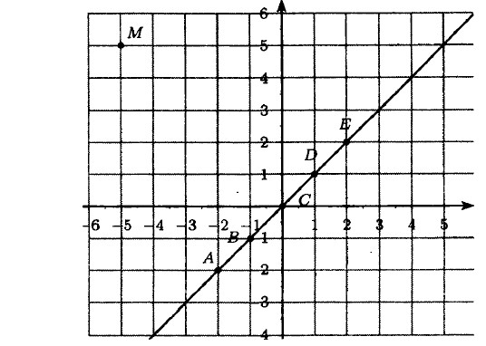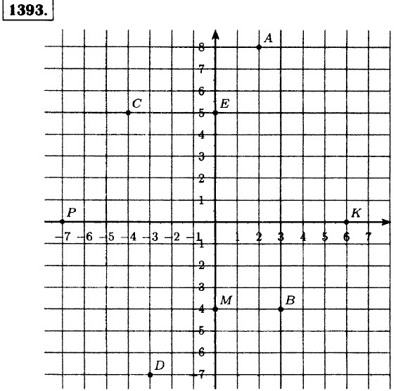 1394. А(2; 4); B(-4; 3); С(-2; -3); D(4; -4). 1395. Абсцисса равна нулю у точек, лежащих на оси Оу. Ордината равна нулю у точек, лежащих на оси Ох. Точка (0; 0) — начало координат. 1396. Эти точки находятся на прямой соответственно проходящей через точку (4; 0) и параллельной оси Оу, или на прямой, проходящей через точку (0; -1) и параллельной оси Ох. 1397. Точки А, В, С, D, Е лежат на одной прямой, точка М не лежит на этой прямой.