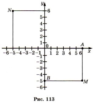 § 9. Координаты на плоскости 45. Координатная плоскостьМеста в зрительном зале кинотеатра задают двумя числами: первым числом обозначают номер ряда, а вторым — номер кресла в этом ряду (см. рис. на форзаце). При этом места (3; 8) и (8; 3) различны: первое является креслом № 8 в третьем ряду, а второе — креслом № 3 в восьмом ряду. Подобным образом можно обозначить и положение точки на плоскости. Для этой цели на плоскости проводят две перпендикулярные координатные прямые — х и у, которые пересекаются в начале отсчёта — точке О (рис. 113). Эти прямые называют системой координат на плоскости, а точку О — началом координат. Плоскость, на которой выбрана система координат, называют координатной плоскостью. Пусть М — некоторая точка координатной плоскости (рис. 113). Проведём через неё прямую МА, перпендикулярную координатной прямой х, и прямую МВ, перпендикулярную координатной прямой у. Так как точка А имеет координату 6, а точка В — координату -5, то положение точки М определяется парой чисел (6; -5). Эту пару чисел называют координатами точки М. Число 6 называют абсциссой точки М, а число -5 называют ординатой точки М. Координатную прямую х называют осью абсцисс, а координатную прямую у — осью ординат. Точку М с абсциссой 6 и ординатой -5 обозначают так: М(6; -5). При этом всегда на первом месте пишут абсциссу точки, а на втором — её ординату. Если переставить координаты местами, то получится другая точка — N(-5; 6), которая показана на рисунке 113.