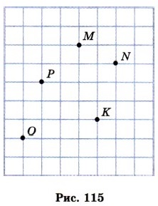 В географии положение точек на земной поверхности тоже определяют двумя числами — географическими координатами: широтой и долготой. Под каким углом пересекаются координатные прямые х и у, образующие систему координат на плоскости? Как называют каждую из этих прямых? Как называют точку пересечения этих прямых? Как называют пару чисел, определяющих положение точки на плоскости? Как называют первое число? Как называют второе число? Расскажите, как найти абсциссу и ординату точки на координатной плоскости. Расскажите, как построить точку по её координатам. 1390. По рисунку 115 определите, сколько клеток надо пройти слева направо и сколько — снизу вверх, чтобы попасть из точки О в точки М, К, Р и N.