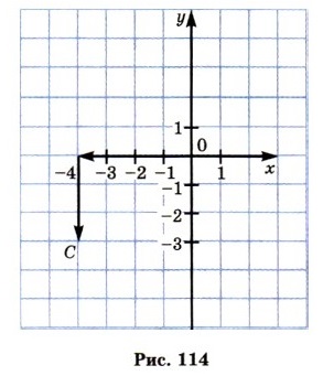 Каждой точке М на координатной плоскости соответствует пара чисел: её абсцисса и ордината. Наоборот, каждой паре чисел соответствует одна точка плоскости, для которой эти числа являются координатами. На рисунке 114 показано, как попасть в точку С с координатами (-4; -3): сначала надо пройти по оси х от начала отсчёта влево на 4 единицы, а потом — на 3 единицы вниз.