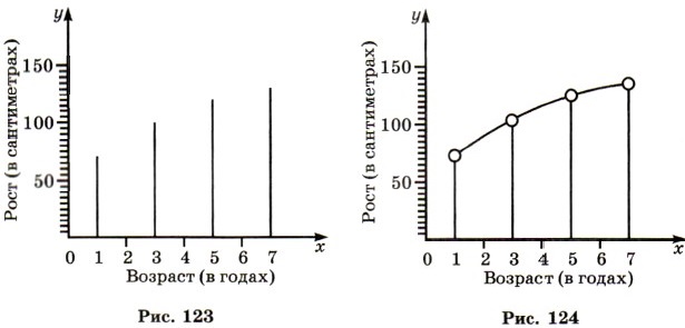 § 9. Координаты на плоскости 47. ГрафикиКогда Маше был год, её рост составлял 70 см, когда ей было 3 года — 100 см, 5 лет — 120 см и 7 лет — 130 см. По этим данным можно построить диаграмму (рис. 123). На этой диаграмме не полностью видно, как менялся рост Маши: она росла всё время, а на диаграмме виден её рост, только когда ей был 1 год, 3 года, 5 лет и 7 лет. Соединим верхние концы столбиков отрезками. Получится ломаная линия, которая нагляднее показывает, как изменялся рост Маши (рис. 124). Мы видим, что в 4 года её рост примерно равнялся 110 см, а в 6 лет — 125 см.