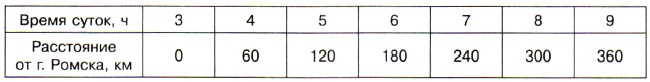 Если бы рост Маши измерялся всё время, то получилась бы не ломаная, а гладкая линия, такая же, как на рисунке 125. По этой линии можно узнать рост Маши в любом возрасте от 1 года до 7 лет. Так, например, в 2 года её рост был 90 см. Эту линию называют графиком роста Маши. Для большей точности построения графиков их чертят на миллиметровой бумаге. Например, график роста Маши на миллиметровой бумаге показан на рисунке 126. Графики чертят и с помощью компьютеров, которые обеспечивают ещё большую точность. Графиками пользуются для изображения движений. Пусть поезд, идущий со скоростью 60 км/ч, вышел в 3 ч утра из г. Ромска. Тогда в 4 ч он окажется на расстоянии 60 км от Ромска, в 5 ч — на расстоянии 120 км от него и т. д. Следующая таблица показывает расстояние от Ромска до поезда в разные моменты времени: