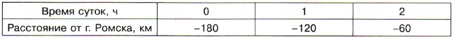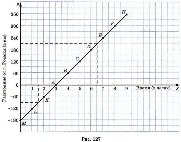 Знак «-» здесь показывает, что поезд ещё не дошёл до г. Ромска, а идёт к нему. Точки с координатами (0; -180), (1; -120); (2; -60) лежат на одной прямой с ранее найденными. Эту прямую называют графиком движения поезда (см. рис. 127). По графику можно узнать, где находился поезд в 6 ч 30 мин (он отошёл от г. Ромска на 210 км), где он был в 1 ч 30 мин (он не дошёл до г. Ромска 90 км), когда он отошёл от г. Ромска на 270 км (в 7 ч 30 мин) и т. д.