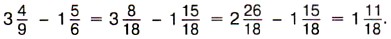 Пишут короче: Если дробная часть уменьшаемого окажется меньше дробной части вычитаемого, то надо превратить в дробь с тем же знаменателем одну единицу целой части уменьшаемого. Пример 4. Найдём значение разности Р е ш е н и е. Приведём дробные части данных чисел к наименьшему общему знаменателю 18:
