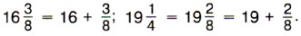 § 2. Сложение и вычитание дробей с разными знаменателями 12. Сложение и вычитание смешанных чиселПереместительное и сочетательное свойства сложения позволяют привести сложение смешанных чисел к сложению их целых частей и к сложению их дробных частей. Пример 1. Найдём значение суммы Р е ш е н и е. Приведём дробные части чисел к наименьшему общему знаменателю 8, затем представим смешанные числа в виде суммы их целой и дробной частей: