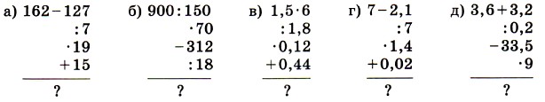 § 3. Умножение и деление обыкновенных дробей 18. Нахождение числа по его дроби (продолжение)661. В киоске в первый день продано 40% всех тетрадей, во второй день — 53% всех тетрадей, а в третий день — остальные 847 тетрадей. Сколько тетрадей продал киоск за три дня? 662. Овощная база в первый день отпустила 40% всего имевшегося картофеля, во второй день — 60 % остатка, а в третий день — остальные 72 т. Сколько тонн картофеля было на базе? 663. Трое рабочих изготовили некоторое число деталей. Первый рабочий изготовил 0,3 всех деталей, второй — 0,6 остатка, а третий — остальные 84 детали. Сколько всего деталей изготовили рабочие? 664. В первый день тракторная бригада вспахала 665. Автомобиль прошёл в первый час 666. Находить число по заданному значению его процентов можно с помощью микрокалькулятора. Например, найти число, 2,4% которого составляют 7,68, можно по следующей программе: Выполните вычисления. Найдите с помощью микрокалькулятора: а) число, 12,7% которого равны 4,5212;