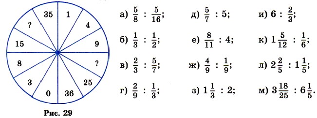 672. Сколько квадратных плиток со стороной 20 см понадобится для настилки пола в комнате, длина которой 5,6 м, а ширина 4,4 м? Решите задачу двумя способами. 673. Найдите правило размещения чисел в полукругах и вставьте недостающие числа (рис. 29). 674. Выполните деление: