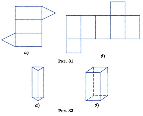 717. Нападающие Коля и Никита во время баскетбольного матча принесли своей команде 718. Поезд, идущий со скоростью 68 км/ч, проходит расстояние между городами за 6 ч. Какое время потребуется велосипедисту, чтобы проехать 719. Получили сплав из куска меди объёмом 15 см3 и куска цинка объёмом 10 см3. Какова масса 1 см3 сплава, если масса 1 см3 меди 8,9 г, а масса 1 см3 цинка 7,1 г? Полученный результат округлите до десятых долей грамма. 720. Кухня в 10 м2 составляет 0,4 всех нежилых помещений квартиры. Площадь нежилых помещений составляет 721. Вырежьте из плотной бумаги фигуры, изображённые на рисунке 31, и склейте фигуры, изображённые на рисунке 32. Эти фигуры называют призмами. У прямой призмы боковые грани — прямоугольники, а верхнее и нижнее основания — равные многоугольники. На рисунке 32, а изображена треугольная призма, а на рисунке 32,6 — четырёхугольная. Каждый прямоугольный параллелепипед — это четырёхугольная призма.