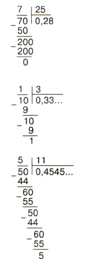 Не все обыкновенные дроби можно представить в виде десятичной дроби. Например, если будем делить 1 на 3, то получим сначала нуль целых, потом три десятых, а далее при делении всё время будут повторяться остаток 1 и в частном цифра 3. Деление никогда не кончится. Значит, дробь Разделив 5 на 11, получим, что В записях 0,333..., 0,4545... и 0,0666... одна или несколько цифр начинают повторяться бесконечно много раз. Такие записи называют периодическими дробями. Вместо 0,333... пишут 0,(3), вместо 0,4545... пишут 0,(45), а вместо 0,0666... пишут 0,0(6). Любое рациональное число можно записать либо в виде десятичной дроби (в частности, целого числа), либо в виде периодической дроби.