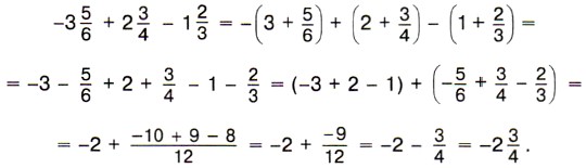 Р е ш е н и е. Сначала представим каждое слагаемое в виде суммы их целой и дробной частей, затем раскроем скобки, потом сложим отдельно целые и отдельно дробные части и, наконец, сложим полученные результаты: