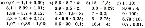 105. Выразите в процентах числа: 0,01; 0,29; 0,8; 1. 106. Выразите в виде десятичных дробей: 2 %, 5%, 10%, 20%, 50%, 68%, 100%, 130%. 107. Длина и ширина прямоугольного параллелепипеда выражаются натуральным числом сантиметров, а высота равна 15 см. Можно ли утверждать, что объём (в кубических сантиметрах) этого параллелепипеда выражается числом: а) кратным 2; б) кратным 3; в) кратным 5? 108. Сколько нечётных четырёхзначных чисел можно составить из цифр 0, 1, 2, 3, 4? Решение. На первом месте в записи числа может стоять любая цифра, кроме нуля, — 4 варианта. На втором и на третьем местах — любая из этих пяти цифр. Так как число нечётное, на последнем месте могут быть только цифры 1 или 3 — т. е. имеем ещё два варианта. В соответствии с правилом умножения получаем, что нечётных четырёхзначных чисел можно составить 4 • 5 • 5 • 2 = 200. 109. Какую цифру нужно приписать к числу 10 слева и справа, чтобы получилось четырёхзначное число, делящееся: а) на 9; б) на 3; в) на 6?