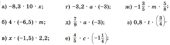 § 8. Решение уравнений 40. КоэффициентПереместительное и сочетательное свойства умножения позволяют упрощать выражения. Пример 1. Упростим выражение 0,3а • (-0,7b). Р е ш е н и е. Это выражение является произведением четырёх множителей: 0,3 • а • (-0,7) • b. Сгруппировав отдельно числовые и отдельно буквенные множители, получим: 0,3а • (-0,7b) = 0,3 • а • (-0,7) • b = (0,3 • (-0,7)) • (а • b) = -0,21 аb. Число -0,21 называют коэффициентом в полученном выражении.