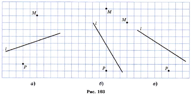 1365. Перечертите рисунок 103 в тетрадь. Проведите через точки М и Р прямые, перпендикулярные прямой