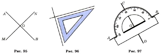 Для построения перпендикулярных прямых используют чертёжный треугольник (рис. 96) или транспортир (рис. 97). Отрезки (или лучи), лежащие на перпендикулярных прямых, называют перпендикулярными отрезками (или лучами) (рис. 98).