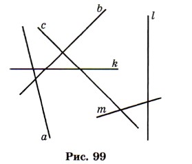 1352. Постройте с помощью транспортира две перпендикулярные прямые. 1353. Определите сначала на глаз, а потом проверьте с помощью чертёжного треугольника, какие пары прямых на рисунке 99 перпендикулярны. 1354. Начертите прямую МР и отметьте точку А, не лежащую на этой прямой. Проведите с помощью чертёжного треугольника через точку А прямую, перпендикулярную прямой МР. Сколько прямых, перпендикулярных МР, можно провести через точку А?