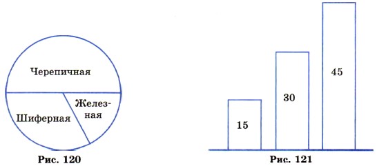 § 9. Координаты на плоскости 46. Столбчатые диаграммыВ селе 90 домов. Из них 15 — под железной крышей, 45 — под черепичной и 30 — под шиферной. Число домов каждого вида изображено на круговой диаграмме (рис. 120). По-другому эти числа можно изобразить с помощью столбчатой диаграммы (рис. 121). Для этого надо нарисовать три столбика, высота которых соответствует количеству домов каждого вида. Пусть высота первого столбика 15 мм, второго 45 мм, третьего 30 мм. Если бы каждый дом изображался столбиком в 2 мм, то высоты всех трёх столбиков на рисунке увеличились бы в 2 раза.