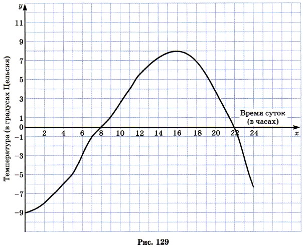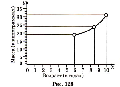 Знак «-» здесь показывает, что поезд ещё не дошёл до г. Ромска, а идёт к нему. Точки с координатами (0; -180), (1; -120); (2; -60) лежат на одной прямой с ранее найденными. Эту прямую называют графиком движения поезда (см. рис. 127). По графику можно узнать, где находился поезд в 6 ч 30 мин (он отошёл от г. Ромска на 210 км), где он был в 1 ч 30 мин (он не дошёл до г. Ромска 90 км), когда он отошёл от г. Ромска на 270 км (в 7 ч 30 мин) и т. д. 1441. На рисунке 128 показан график изменения массы Пети в зависимости от его возраста. Какова масса Пети в возрасте 6 лет; 8,5 лет; 10 лет? 1442. На рисунке 129 изображён график изменения температуры воздуха в течение суток. Ответьте на следующие вопросы: