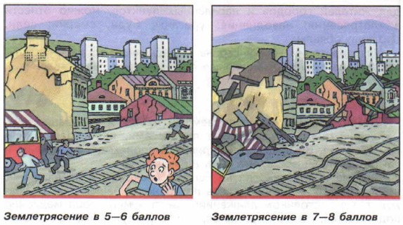 Последствия любого землетрясения зависят от его силы. Сила (интенсивность) землетрясения определяется по внешним его проявлениям и измеряется в баллах. Имеется несколько способов (шкал) для измерения интенсивности землетрясений в баллах (шкала Рихтера, шкала ИФЗ, шкала MSK-64). Рассмотрим определение силы землетрясения по шкале, названной в честь итальянского учёного Джузеппе Меркалли. Баллы (от 1 до 12) служат для удобства определения относительной силы землетрясения по его внешним проявлениям. Так, землетрясение силой 5—6 баллов приводит к лёгкому повреждению зданий: трескается штукатурка, бьются стёкла. Человеку трудно устоять на ногах. Землетрясение силой 7 — 8 баллов приводит к частичному разрушению зданий, происходит разрушение железнодорожных путей. На склонах гор появляются оползни. Землетрясение силой 9 баллов и выше приводит к полному разрушению зданий, на почве образуются провалы.