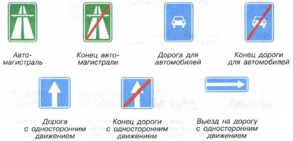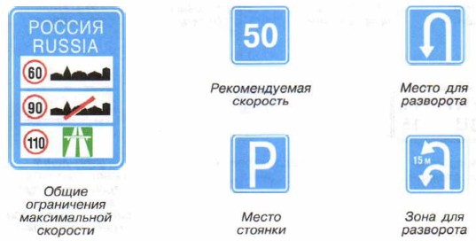 Информационные знакиЭти знаки информируют водителей о расположении населённых пунктов, надземных и подземных пешеходных переходов, а также об установленных направлениях движения.
