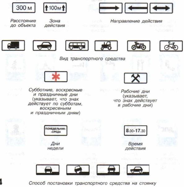 Знаки дополнительной информации (таблички)Эти знаки содержат дополнительную информацию, уточняющую или ограничивающую действие других знаков. Так, если табличка «Расстояние до объекта» расположена вместе с предупреждающим знаком «Пешеходный переход», то цифра на табличке указывает расстояние до пешеходного перехода.