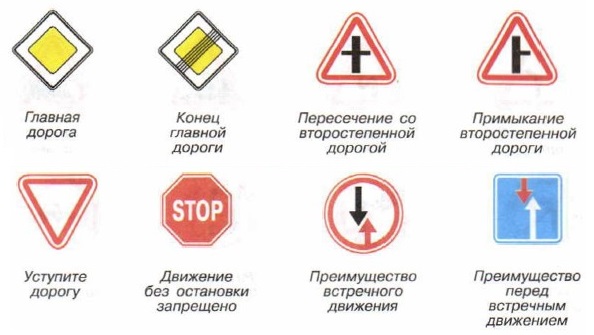 Знаки приоритетаОни устанавливают очерёдность проезда перекрёстков, пересечения проезжих частей или узких участков дороги. Могут иметь различную форму.