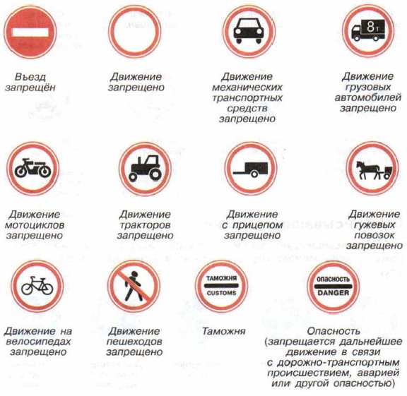 Запрещающие знакиЭти знаки запрещают движение или выполнение отдельных манёвров; имеют форму круга.