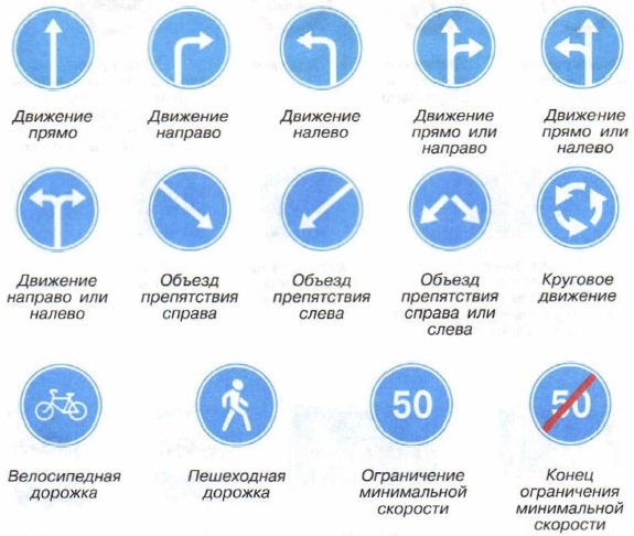 Предписывающие знакиПредписывающие знаки не вводят запретов, а указывают, кому и куда можно передвигаться; в основном имеют форму круга.
