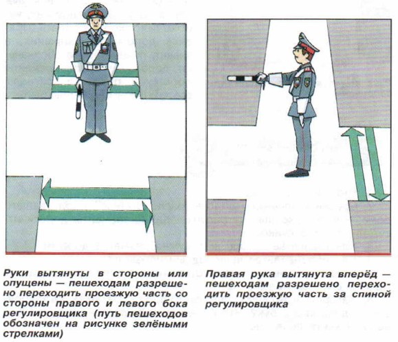 В некоторых случаях движением на дорогах управляет регулировщик. Он может подавать сигналы руками, положением корпуса, при помощи жезла или флажков. Регулировщик находится в центре перекрёстка, на линии, разделяющей встречные потоки транспорта, или на краю проезжей части. Сигналы, подаваемые регулировщиком с центра перекрёстка или с осевой линии дороги, обязательны для всех участников дорожного движения. Рассмотрим основные сигналы, подаваемые регулировщиком. Если на перекрёстке, где работает светофор, вы видите регулировщика, то необходимо подчиняться именно его сигналам. Ещё раз подчеркнём: для того чтобы чувствовать себя уверенно на улицах и дорогах, необходимо хорошо знать Правила дорожного движения, а значит, понимать, что обозначают дорожные знаки, элементы дорожной разметки, сигналы светофора и регулировщика.