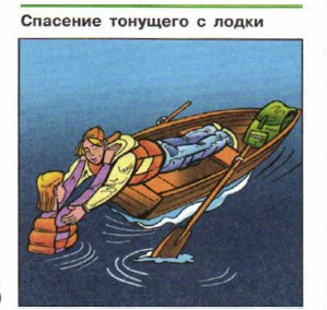 Спасение тонущего. Если возникает необходимость в спасении тонущего, то нужно подойти к нему носом или кормой. После этого один из находящихся в лодке, лёжа на носу или на корме и зацепившись ногами за скамейку (банку), помогает тонущему подняться в лодку. Вытаскивать тонущего с борта не следует, так как в этом случае лодка может перевернуться и туристы, находящиеся в ней, могут также оказаться в воде.