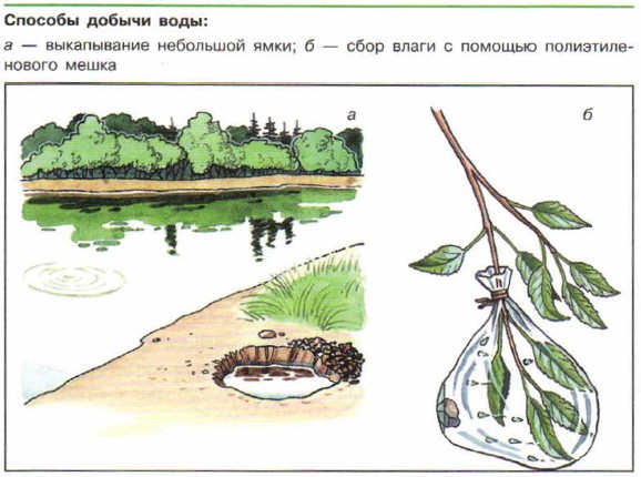 Доступным источником воды в природе являются влагосодержащие растения, например берёза, дающая берёзовый сок. Можно получить воду, если на ветку лиственного дерева надеть полиэтиленовый мешок, положив на его дно камешек и туго завязав мешок у основания. Через некоторое время на внутренней стороне плёнки появятся капли влаги, которые будут стекать на дно пакета. Можно пить утреннюю росу, если научиться собирать её. Для этого надо с вечера положить кучку мелких камней (гальки) на брезент, и к утру на нём соберется вода. Обеспечение питаниемНа Земле нет мест, где подготовленный человек не смог бы найти себе пищу. В природных условиях её можно добывать охотой и рыболовством (если для этого есть соответствующие приспособления), отыскивать съедобные растения, ягоды, грибы и орехи (см. Приложение 4). Растительная пища может в течение длительного времени поддерживать жизнедеятельность человека. На территории России встречается большое количество дикорастущих растений, пригодных в пищу. Это яблоня, груша, рябина, малина, смородина, черника, брусника, клюква, земляника. Съедобны молодые побеги тростника, корневища кувшинок, внутренний слой коры молодых деревьев, почки берёзы, липы.