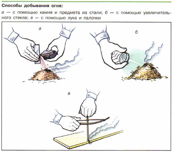 А если спичек нет? Древний человек добывал огонь при помощи огнива, кремня и трута. В качестве трута можно использовать сухой мох, мелко раздробленную кору, древесную пыль, которую можно найти под корой засохших деревьев. В качестве кремня можно использовать твёрдый камень, в качестве огнива (или кресала) — лезвие ножа или любой предмет из стали. Для получения огня этим способом камень следует держать как можно ближе к труту, ударяя по камню кресалом так, чтобы искры падали на середину трута. Когда трут начнёт потихоньку тлеть, нужно раздуть это тление до появления огня, от которого поджечь заранее приготовленную растопку.