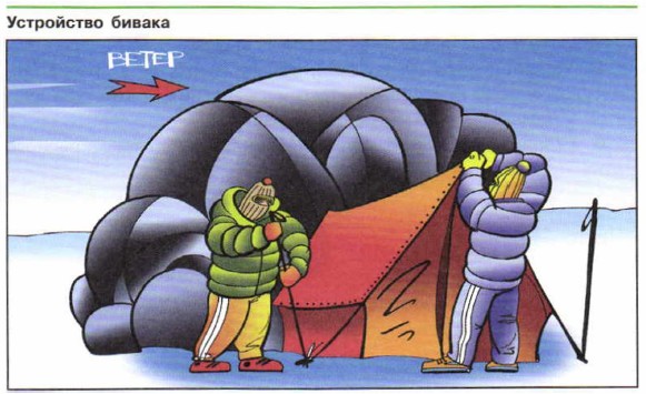 Глава 5. Опасные ситуации в природных условиях Опасные погодные явления (окончание)Первоочередная задача, стоящая перед группой туристов до или после наступления пурги, — устройство бивака. При постановке палатки следует найти хотя бы частичное укрытие от ветра. Палатку устанавливают входом с подветренной стороны, её растяжки закрепляют, воткнув их в снег лыжами или лыжными палками. После установки палатки заносят рюкзаки, которые укладывают у задней наветренной стенки и по углам палатки.