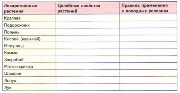 Глава 6. Первая помощь при неотложных состояниях Личная гигиена и оказание первой помощи в природных условиях (окончание)Каждому человеку, который любит активный отдых на природе, необходимо знать некоторые лекарственные растения, их целебные свойства и правила применения. Крапива — многолетнее травянистое растение. Растёт по тенистым влажным местам, оврагам, обочинам дорог, между кустарниками. Листья крапивы обладают кровоостанавливающим действием и способствуют заживлению ран. Прикладывают к ране свежие измельчённые листья. Подорожник — многолетнее травянистое растение. Распространён по всей территории России. Растёт вдоль дорог, на полях, по лесным опушкам и берегам водоёмов. Свежий сок подорожника останавливает кровотечения, обеззараживает раны, обладает бактерицидным и заживляющим свойством. Перед использованием листья подорожника необходимо вымыть, измельчить и прикладывать к ране. Полынь — многолетнее травянистое растение, распространённое во всех регионах России. Растёт на сырых лугах, по берегам рек, по пустырям. Полынь обладает жаропонижающим, обеззараживающим и общеукрепляющим свойством. Листья полыни применяются в тех же случаях, что и листья подорожника. Растения, которые можно встретить в походе и использовать как лекарственные средства, вы увидите в Приложении 6.