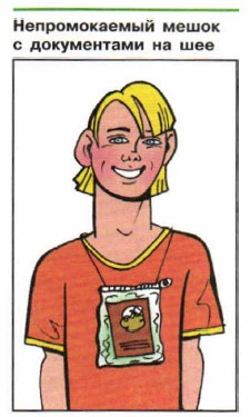 Документы и деньги должны быть упакованы в непромокаемый мешок, который необходимо постоянно держать при себе (можно носить его в застёгивающемся кармане плавок, шорт или повесить на шею).