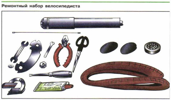 Глава 2. Активный отдых на природе и безопасность Велосипедные походы и безопасность туристов (продолжение)Подготовка к велосипедному походуПри подготовке к любому велосипедному походу необходимо тщательно осмотреть велосипед, выявить и устранить неисправности и отклонения в работе, особенно подвижных частей, протереть и смазать все трущиеся детали, проверить балансировку колёс и накачку шин, работу тормозов, укрепить багажник. После этого нужно опробовать велосипед на ходу. При подготовке к походу необходимо продумать и подобрать снаряжение с учётом длительности и сложности маршрута. В снаряжение велотуриста, кроме обычных вещей, необходимых в любом туристском походе (палатка, рюкзак, посуда, костровое оборудование и др.), обязательно входит ремонтный набор (даже в однодневном походе). В ремонтный набор входят: комплект гаечных ключей, плоскозубцы, отвёртка, резиновый клей, резина для заплат, ножницы, велосипедный насос и запасные детали (запасная шина или камера, гайки, шайбы, шарикоподшипники, спицы, тормозные колодки и др.).