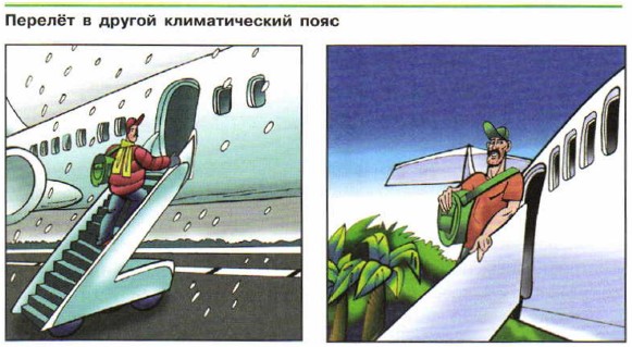 Глава 3. Дальний (внутренний) и выездной туризм и меры безопасности Основные факторы, оказывающие влияние на безопасность человека в дальнем (внутреннем) и выездном туризмеВ последнее время в нашей стране туризм приобретает всё большую популярность и становится одним из основных видов активного отдыха, с помощью которого человек познаёт окружающий мир, знакомится с культурой, обычаями и традициями различных народов, проверяет свои физические и духовные возможности в преодолении различных трудностей. Сегодня растёт популярность дальнего и выездного туризма. Дальний (внутренний) туризм — разновидность выездного туризма, это путешествия в пределах Российской Федерации, в районах, значительно отдалённых от места жительства (в других областях и регионах). Выездной туризм — это путешествия в зарубежные страны. Дальние и выездные туристические путешествия связаны с передвижением человека на различных видах транспорта: железнодорожном, морском, авиационном и автомобильном. Эти путешествия также связаны с перемещением человека на значительные расстояния, в другой часовой пояс и в другие климатические условия. Вы уже знакомы с тем, что земная поверхность условно разделена на 24 часовых пояса. В пределах пояса люди живут по единому времени, которое ровно на 1 ч отличается от времени соседнего пояса. Так, например, разница во времени по сравнению с Москвой составит: в Екатеринбурге 2 ч, в Омске 3 ч, в Новосибирске 4 ч; в Якутске б ч, в Петропавловске-Камчатском 8 ч. Если вы на самолёте или поезде прибудете из Москвы в Новосибирск, то весь режим вашей жизни сместится на 4 ч вперёд, а это создаст определённый дискомфорт для вашего организма — ему необходимо какое-то время, чтобы перестроиться на новый режим.