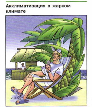Чтобы избежать этих и других неприятностей, важно с первого дня приспособить свой режим к местным климатическим условиям. Для этого стоит внимательно присмотреться к одежде и режиму дня местных жителей. В жару лучше надевать одежду светлых тонов из хлопчатобумажной ткани, на голове носить лёгкий белый головной убор. В жаркий день надо чаще быть в тени, в самое знойное время (с 13 до 16 ч) можно поспать. Нельзя чрезмерно увлекаться загаром. Лучше загорать в утренние часы с постепенным увеличением дозы солнечных ванн. Чтобы быстрее акклиматизироваться, очень важно соблюдать водно-солевой режим, при котором обеспечивается нормальное соотношение между количеством поступающих в организм и выводимых из него воды и минеральных солей. В жару пить надо не только для того, чтобы утолить жажду, но и чтобы возместить потерю воды и минеральных солей, которые вместе с потом уходят из тела. Пить нужно медленно, небольшими глотками. Можно пить минеральную воду, хорошо утоляет жажду чай.