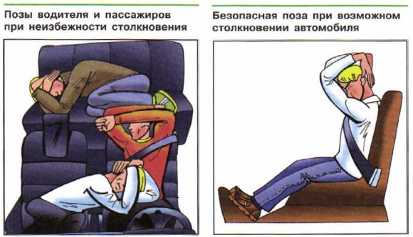 Вы едете с родителями на личной автомашине за город. Перед началом движения обязательно пристегнитесь ремнями безопасности, накидывание ремня лишь для вида (без необходимого натяжения) при аварии станет причиной дополнительных травм. Автомобиль сталкивается. Сильно напрягите всё тело (мышцы), втяните голову в плечи. Расслабляться нельзя до полной остановки автомобиля. Не покидайте автомобиль до его полной остановки. Нельзя выпрыгивать из автомобиля при его столкновении, переворачивании. Шансов уцелеть больше, если будете находиться внутри. Автомобиль переворачивается. Падайте на соседнее сиденье (если не пристёгнуты ремнями), покрепче схватитесь за него и уткнитесь в него лицом.
